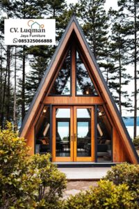 Rumah A-Frame kayu modern ini menawarkan desain natural yang hangat dengan jendela kaca besar untuk pencahayaan maksimal. Struktur segitiga yang khas membuat hunian kokoh, elegan, dan sangat cocok sebagai villa, cabin, atau rumah berlibur yang menyatu dengan alam.