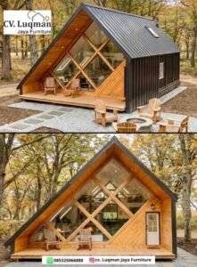Rumah kayu ini merupakan contoh menakjubkan dari arsitektur kabin A-frame modern. Desain A-frame klasik, yang dicirikan oleh bentuk segitiga tajamnya. Rumah ini dirancang untuk memaksimalkan pemandangan alam dan cahaya alami, sekaligus memberikan tempat perlindungan yang nyaman dan hangat.