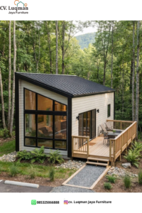 Rumah ini mengusung tema modern cabin atau tiny house dengan gaya konteporer yang sangat cocok untuk vila atau rumah peristirahatan di area pegunungan. Desainnya menonjolkan kesan minimalis namun fungsional. Menggunakan atap miring satu sisi (lean-to) bewarna hitam metalik. Desain ini efektif untuk mengalirkan air hujan dengan cepat dan memberikan ruang plafon yang tinggi dibagian intertior. Dinding menggunakan panel kayu horizontal. Pada bagian depan didominasi oleh jendela kaca besar mengikuti kemiringan atap. Hal ini memaksimalkan pencahayaan alami ndan memberikan pandagan luas ke arah pemandangan. Dilengkapi dengan area outdoor (teras) yang cukup luas, lengkap dengan pagar pembatas kayu, yang dapat difungsikan sebagai area santai keluarga.