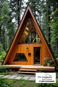 Desain yang Cerdas dan Fungsional: Meskipun disebut tiny house, desain A-Frame ini sangat pintar dalam memanfaatkan ketinggian dan memaksimalkan ruang vertikal. Interiornya seringkali dilengkapi loft atau mezanin yang dapat berfungsi sebagai kamar tidur atau area kerja, memisahkan zona privat tanpa mengorbankan kesan terbuka di ruang utama. Dilengkapi dengan dek kayu kecil di depan, Anda memiliki area tambahan yang ideal untuk bersantai, menikmati kopi, atau sekadar menghirup udara segar di tengah pepohonan. CV. Luqman Jaya Furniture adalah mitra terpercaya Anda untuk merealisasikan kabin impian ini dengan pengerjaan detail yang presisi dan estetika yang tak tertandingi.