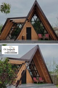 Be the first to review “Unik dan Artistik! Desain Kabin A-Frame Jendela Geometris – Rumah Modular Kayu Modern untuk Glamping”